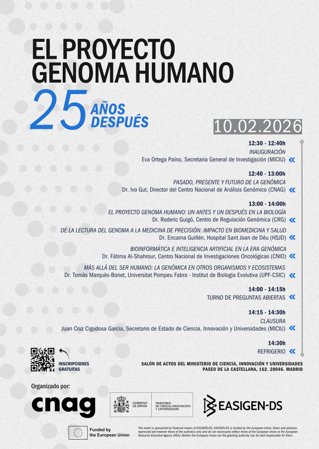 The event will take place on February 10 2026, in the Assembly Hall of the Ministry of Science, Innovation and Universities, in Madrid, Spain. It will feature a round table with experts reflecting on 25 years of the Human Genome Project and its impact on human health, biodiversity, and the AI challenges that lie ahead.